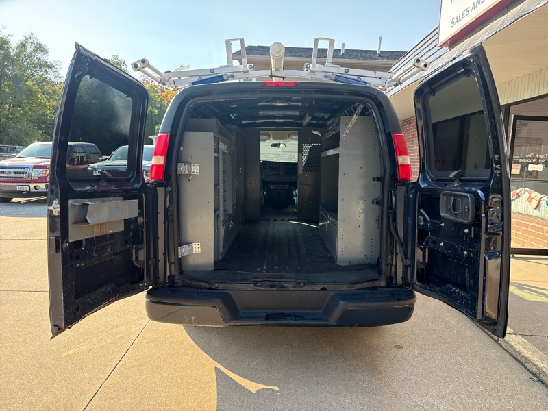 2009 Chevrolet Express 1500 Cargo Van, 5.3 v8 engine, Automatic transmission, rear-wheel drive, blue exterior, ladder rack and built-in tool storage shelving, dual swing-out rear doors, side cargo door, heavy-duty seats, air conditioning, AM/FM stereo, power windows & locks, tilt steering wheel, daytime running lamps, steel wheels, traction control, stability control, 4-wheel ABS brakes, tire pressure monitoring system.